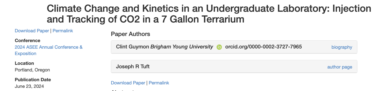Joseph Tuft and Clint Guymon (2024, June), Climate Change and Kinetics in an Undergraduate Laboratory: Injection and Tracking of CO2 in a 7 Gallon Terrarium Paper presented at 2024 ASEE Annual Conference & Exposition, Portland, Oregon. Web Link.