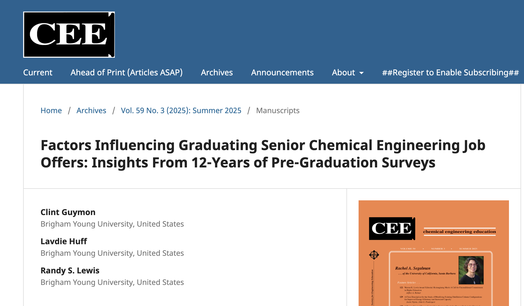Guymon, C., Huff, L. & Lewis, S. L., Factors Influencing Graduating Senior Chemical Engineering Job Offers: Insights From 12-Years of Pre-Graduation Surveys, Chemical Engineering Education Journal, Vol. 59 No. 3 Summer 2025. Web Link