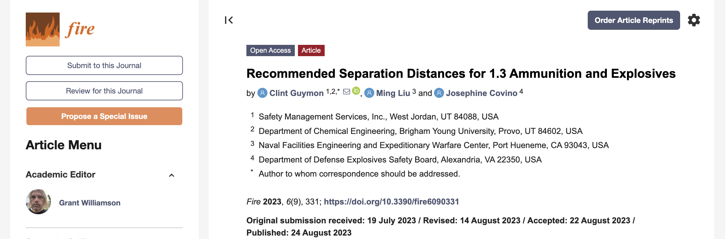 Guymon, C.; Liu, M.; Covino, J., “Recommended Separation Distances for 1.3 Ammunition and Explosives,” Fire 2023, 6, 331. Guymon et al. (2023)