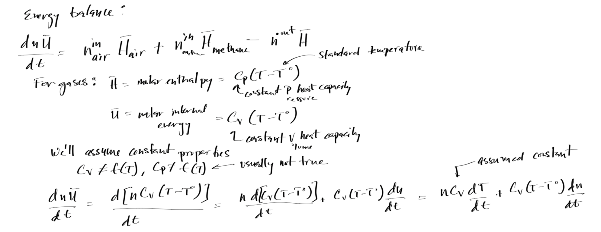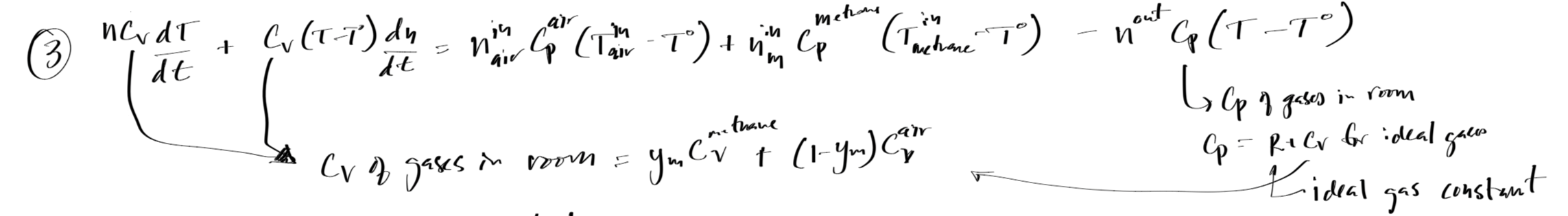 dTdt = 1/(n*Cv)*(- Cv*(T-T0)*dndt + nin_air*(Cv_air+Rg)*(Tairin-T0) + nin_m*(Cv_m+Rg)*(Tmin-T0) - nout*(Cv+Rg)*(T-T0))